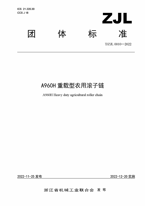 近日,浙江省機(jī)械工業(yè)聯(lián)合會(huì)批準(zhǔn)、發(fā)布團(tuán)體標(biāo)準(zhǔn)T/ZJL 0010—2022《A960H重載型農(nóng)用滾子鏈》(以下簡(jiǎn)稱《A960H鏈條》),自12月20日起實(shí)施。這項(xiàng)浙機(jī)聯(lián)團(tuán)體標(biāo)準(zhǔn)由東華牽頭負(fù)責(zé)制定,東風(fēng)農(nóng)機(jī)集團(tuán)等4家單位參加起草?!禔960H鏈條》標(biāo)準(zhǔn)規(guī)定了適用于在各類農(nóng)作物作業(yè)機(jī)械上使用的A960H重載型農(nóng)用滾子鏈的主要參數(shù)和尺寸、技術(shù)要求、試驗(yàn)方法、檢驗(yàn)規(guī)則等要求。